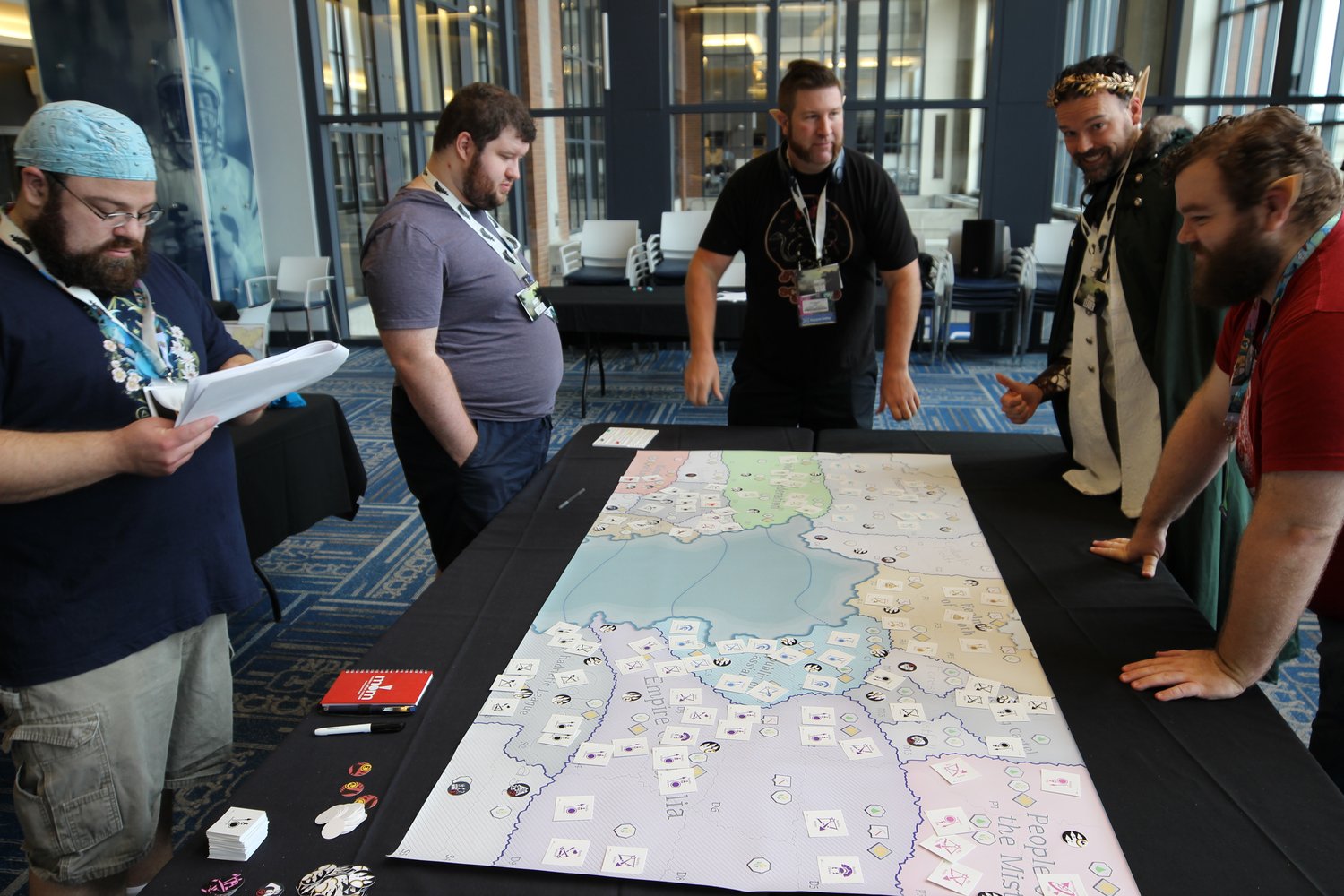 Crucible of Nations is an innovative and fast-paced new megagame for twenty-six to thirty-five players. For six hours, teams of four take the helm of a fantasy nation, conducting diplomacy, waging wars, developing their capabilities, and strategizing to achieve their unique national objectives. Each nation in Crucible has a distinctive background, unique starting position, special abilities, and a set of secret national objectives. Players are striving to fulfill these objectives to the best of their ability over the course of the game, making decisions that will impact thousands and cement their legacy for centuries to come.